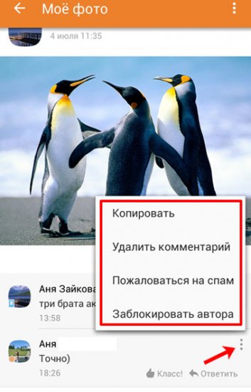 Как удалить комментарий к фотографии в Одноклассниках через мобильное приложение